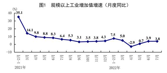 看工業(yè)。7月份,全國(guó)規(guī)模以上工業(yè)增加值同比增長(zhǎng)3.8%,比上月回落0.1個(gè)百分點(diǎn);環(huán)比增長(zhǎng)0.38%。