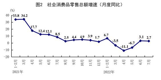 看消費(fèi)。7月份,社會(huì)消費(fèi)品零售總額同比增長(zhǎng)2.7%,增速比上月回落0.4個(gè)百分點(diǎn)。