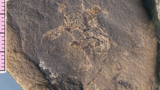 “2015年的一次普通野外踏勘工作中,我的學(xué)生代旭在一塊黑色頁(yè)巖上發(fā)現(xiàn)了一枚非常奇特的化石碎片!彼魏\娊榻B,后來(lái)經(jīng)鑒定這枚化石是在早三疊世海相地層中罕見的龍蝦化石碎片。