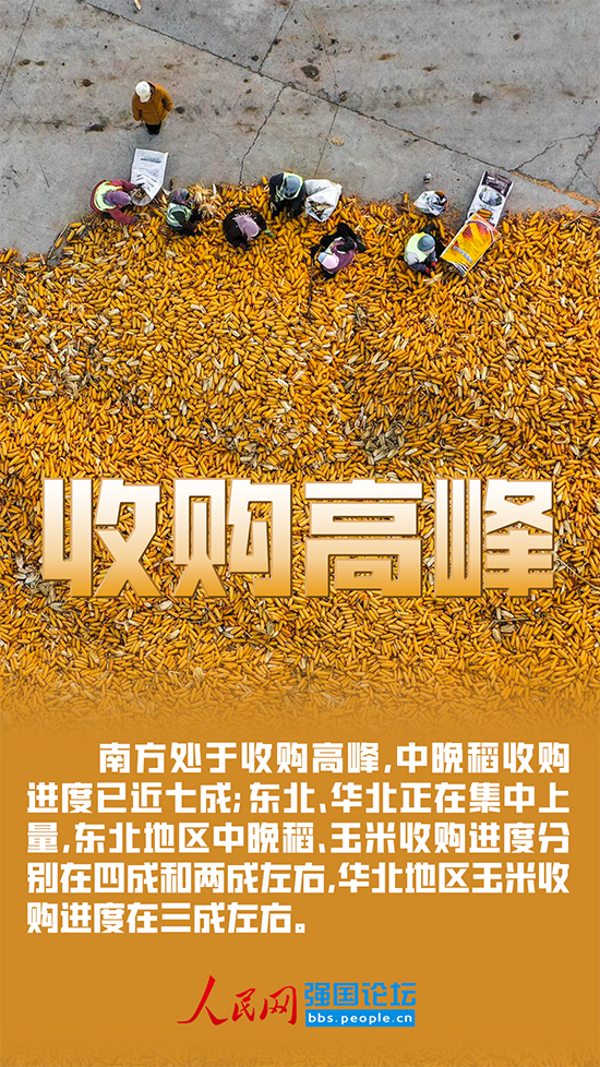 當前,南方處于收購高峰,中晚稻收購進度已近七成;東北、華北正在集中上量,東北地區(qū)中晚稻、玉米收購進度分別在四成和兩成左右,華北地區(qū)玉米收購進度在三成左右。
