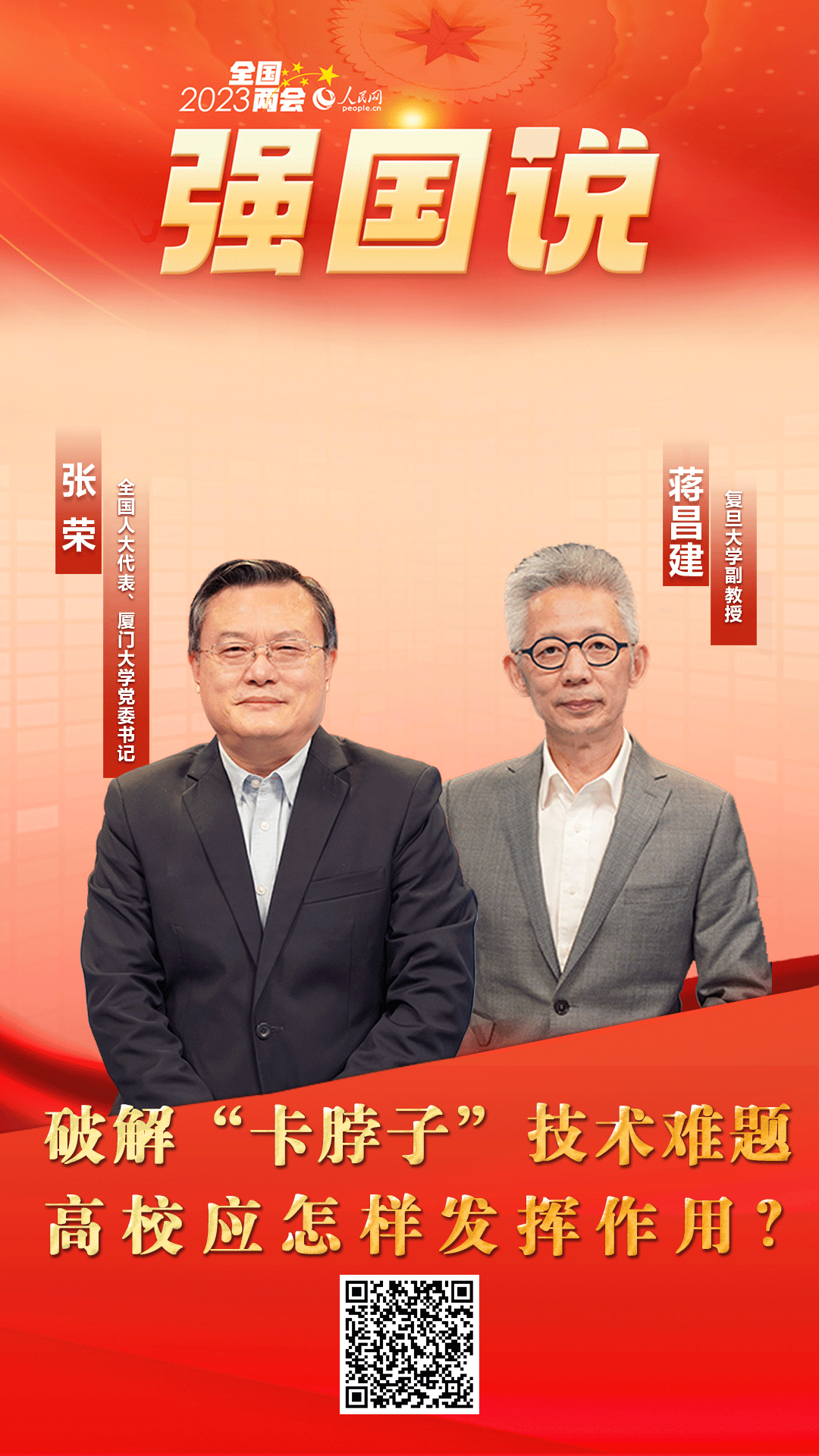 教育、科技、人才是全面建設(shè)社會主義現(xiàn)代化國家的基礎(chǔ)性、戰(zhàn)略性支撐。2023年全國兩會期間,人民網(wǎng)《強國說》欄目邀請全國人大代表、廈門大學(xué)黨委書記張榮與復(fù)旦大學(xué)副教授蔣昌建,就相關(guān)話題展開探討交流。